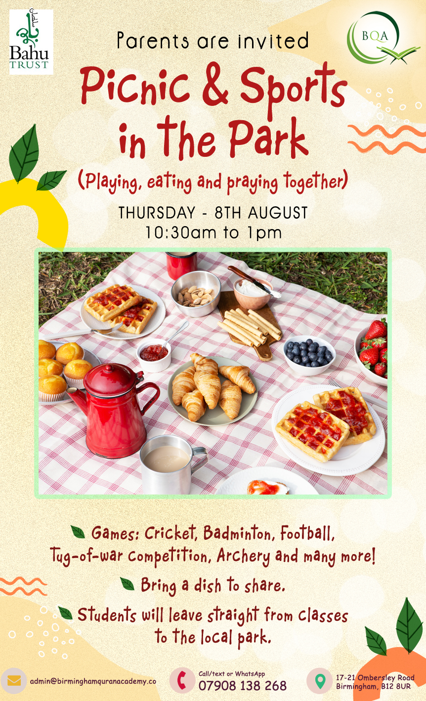 We would like parents to “bring in a dish” to share so that students and parents can sit together and eat so that we can build a community spirit, increase blessings and have a fun day for all to sit together and eat in each other’s company as well as enjoying a nice day out. We will also be praying Salah-Tul- Zuhr together in the park inshaAllah.